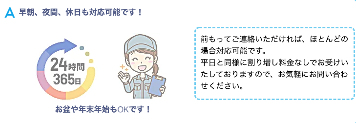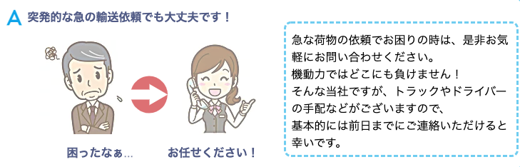 Q 早朝や夜間、休日の輸送は? 時間指定は出来ますか?